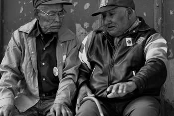Dick Nukon and Hyacinthe André, both former chiefs from small Gwich'in village. Nukon, from Old Crow, Hyacinthe from Arctic Red River, now know as Tetlit Zheh. Gatherings, such as the one held at Fort Yukon, provide these two friends the opportunity to share ideas. Old Crow is located about 250 river miles from Ft. Yukon, while Tetlit Zheh is located along the McKenzie River. Though the settlement often floods in the springtime, the Dene (Gwich'in) settled at the spot in 1852 because it provided a good view of the Mackenzie Delta.